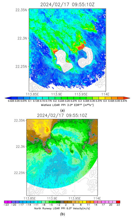 The simulated EDR image (a) and six-degree PPI velocity image of the LIDAR (b) for the 17 February 2024 windshear case. All the figures are north–south oriented.
