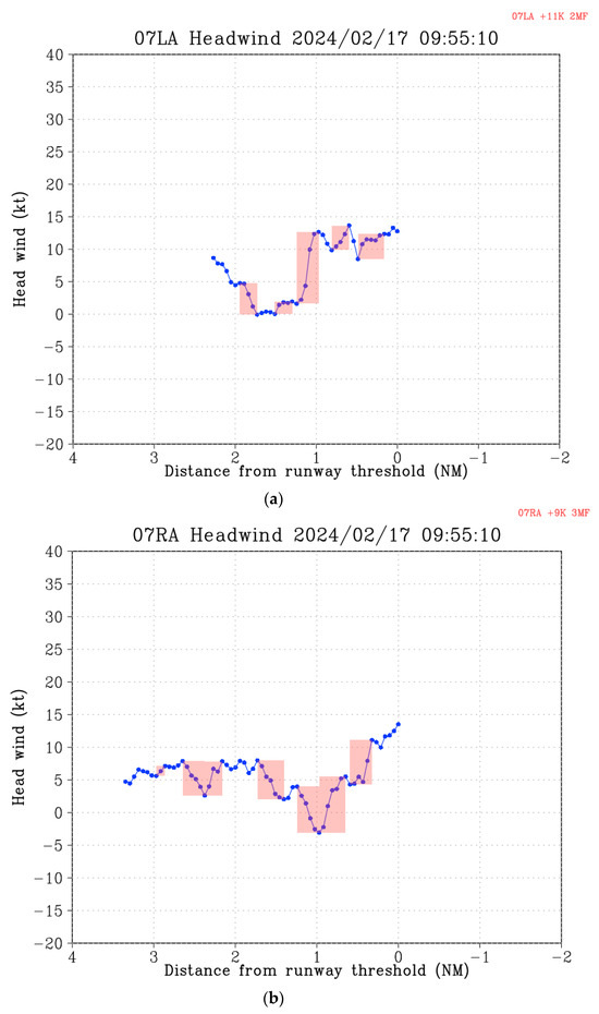 Two simulated headwind profiles (a,b) for the 17 February 2024 windshear case. The areas highlighted in red are the automatically identified windshear.