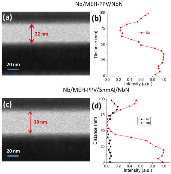 HR-TEM and EDS profile. (a) TEM and (b) EDS of Nb for a device without the Al layer. (c) TEM and (d) EDS of Nb and Al for a device with 5 nm Al protective layer.