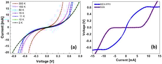 (a) Current vs. voltage of the SC-O-SC junction for temperatures between 2 K and 300 K. IV curves show space-charge-limited conductivity for the MEH-PPV layer. (b) V vs. I measured at 11 K for NbN (purple) and MEH-PPV (blue). NbN displays a critical current of 8 mA. The onset of negative differential resistance in the device corresponds with the critical current.