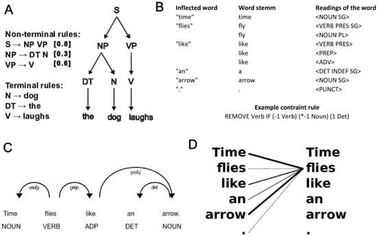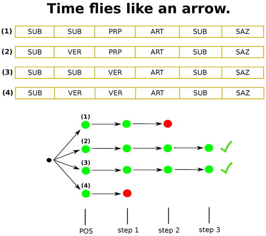 Figure 3 illustrates this procedure, which is applied to the grammatically ambiguous sentence “Time flies like an arrow”. This sentence has a non-obvious interpretation, where the animals “time flies” care about “ an arrow”, which involves alternative word class interpretations for the words “flies” and “like”. The word “flies” can be a substantive or verb, whereas the word “like” can be a preposition or a verb. In total, this leads to four interpretations for the four word class combinations shown in the upper part of
