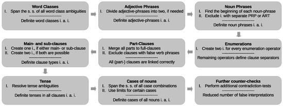 Figure 5 outlines all the parsing steps involved in the syntactic analysis required to address various ambiguities. An ambiguity is considered “disambiguated” when each possible resolution is realized in a separate interpretation. In some cases, the same type of ambiguity can occur multiple times independently within a sentence as detailed in the work of Strübbe et al. (2023) [