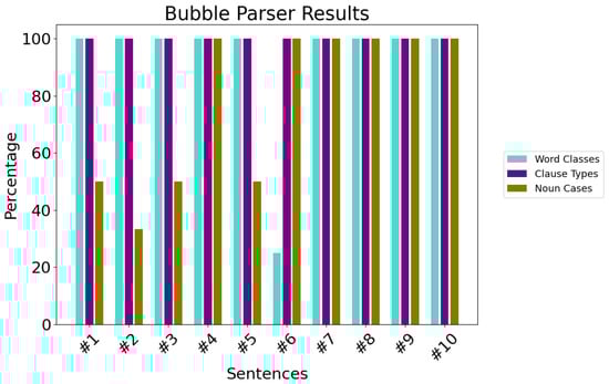 The same ten sentences are then analyzed by the bubble parser but only once because its response is always the same due to its deterministic logic. Depending on the selected settings, the parser shows the word classes, the clauses detected, and the grammar cases of the nouns. The corresponding outputs for the ten sentences are listed in detail in