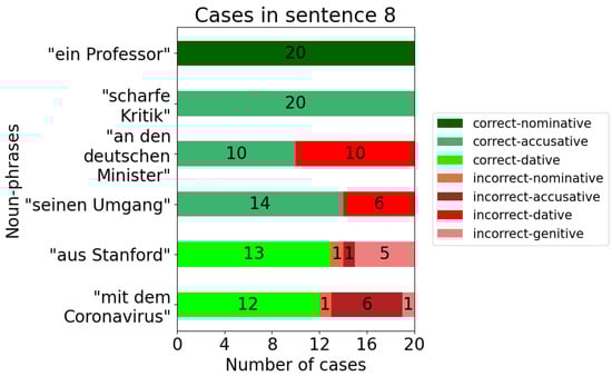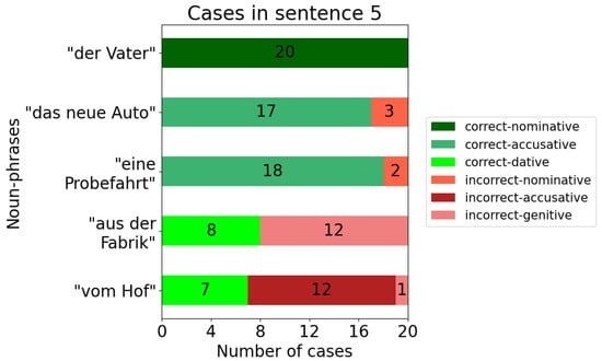 The LLMs are asked these questions followed by one of the ten German sentences, but with no further context, e.g., the results from previous requests. One of the responses of the LLMs is shown in