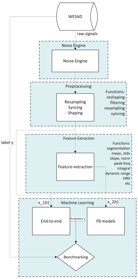 The primary objective of this study was to rigorously evaluate the effectiveness and accuracy of ML and deep learning (DL) models to detect anxiety under various levels of noise. Specifically, the study sought to understand the extent to which these models can maintain accuracy in identifying and classifying anxiety-related patterns amidst noise interference. Furthermore, this research aimed to explore the potential benefits of employing deep learning end-to-end models in improving the robustness of anxiety detection systems against noisy conditions. To this end, this study utilized the Wearable Stress and Affect Detection (WESAD) dataset [], a publicly available resource, as the basis for experimentation. This dataset was augmented with synthetic noise to simulate real-world noisy environments, thereby providing a platform to assess model performance as a function of noise interference. In pursuit of replicating and benchmarking against the state-of-the-art, this study adhered closely to established literature [,,] in terms of filtering parameters, data processing techniques, and methodologies for feature selection and extraction. This approach ensured that the findings were grounded in current best practices [,,,], allowing for a meaningful contribution to the field of anxiety detection.