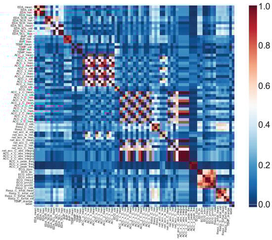Spearman correlation between all features, including labels. Features of some modalities were too closely correlated with each other to warrant inclusion. For example, for EDA features, EDA mean, min, and max are almost identical, unlike EDA std. In that case, only one of the three features was kept.