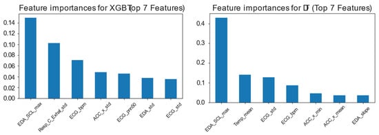 For feature-based models, XGB and DT performed the best with an accuracy of 0.99 and F1-score 0.99 for both models (Table 3). After evaluating the feature-based model performance results, features were explored for each of the models to determine importance of features (Figure 3), as well as importance of modalities. As can be seen in Table 4, the Skin Conductance Level (SCL) max feature from EDA was the feature of the highest importance for six of the seven models. This result led to EDA being defined as the most important modality for anxiety detection, and more specifically SCL max. The second most important feature was BVP max and ranked number 2. In Table 4, the columns categorize and quantify the contributions of different physiological signals and their specific features to the model’s performance.