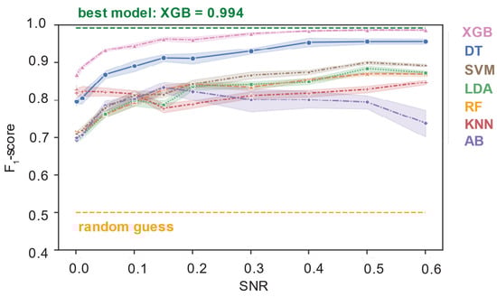 This trend underscores the importance of optimizing noise handling capabilities within feature-based models to ensure their effectiveness in real-world applications where noise variability is common. With noise, performance degraded proportionally with increasing noise (smaller SNR value). These results were consistent for all models, except for AB. Another finding was that XGB outperformed DT and maintained the performance advantage across the range of SNR tested, solidifying its position as the best performing model across conditions tested.