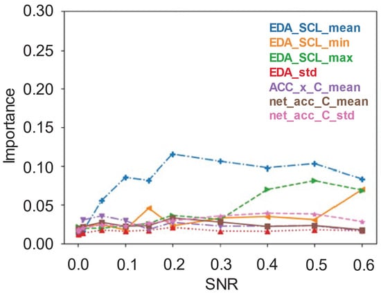 With respect to feature importance, it was observed that feature importance ranking was also relatively consistent across SNR. For example, looking at the feature importance ranking for XGB across different SNR in Figure 5, EDASCL_mean continued to be the top feature across all SNR.