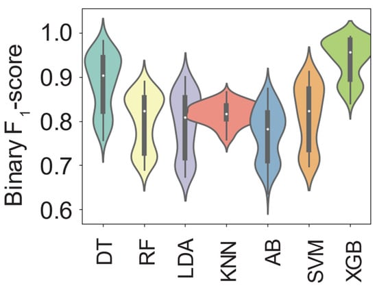 For our implementation, we combined the traditional feature-based approaches as well as the state-of-the-art end-to-end models in this study. Seven feature-based models were examined. Following the literature and Schmidt’s [] choice for feature-based models, we included Decision Tree (DT), Random Forest (RF), Adaboost (AB), Linear Discriminant Analysis (LDA), and k-nearest neighbor (kNN). Support Vector Machine (SVM) was included as it is one of the most commonly used algorithms in the literature. XGBoost (XGB) was also added as an improvement over existing implementation of boosting algorithms, such as Adaboost, as it has been shown to perform better []. All the feature-based models were created using scikit-learn 1.2.1 ML library [].