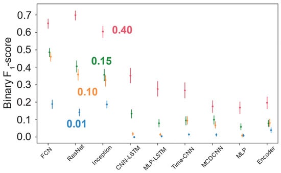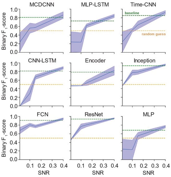 With the noisy dataset, performance of all end-to-end models significantly degraded (Figure 7, Table 6). FCN and ResNet achieved mean F1-scores of 0.75 (standard deviation, 0.24) and 0.74 (0.22). Noteworthy changes were that ResNet outperformed FCN in the SNR = 0.4 case, but was overtaken again at higher noise levels (lower SNR) (Figure 6). At higher noise levels, all models underperform random guess for the binary case (i.e., F1-score of 0.5).