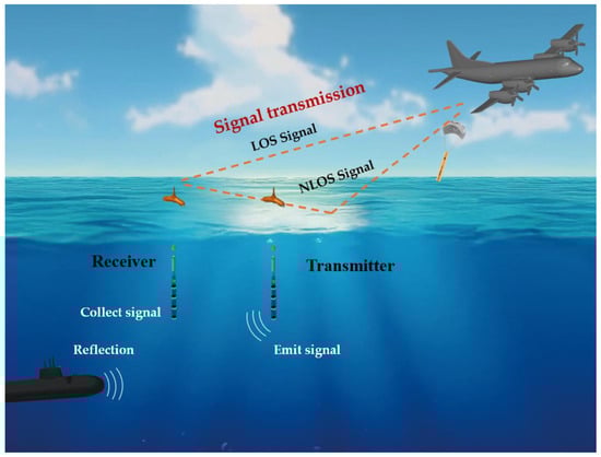 This equipment comprises a buoy and an acoustic collection device. The acoustic collection device gathers acoustic signals generated underwater, and the collected signals are transmitted via the buoy to platforms such as Maritime Patrol Aircraft (MPA) [3]. The platform analyzes the received signals to detect and classify underwater targets. Figure 1. illustrates the underwater acoustic collection scenario in a bistatic environment using active and passive sonobuoys in ASW, where the collected acoustic signals are transmitted through wireless communication to the MPA.