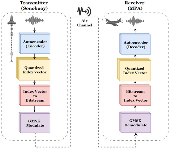 In this paper, we propose a signal compression autoencoder tailored for the transmission and reception environment of DIFAR sonobuoys, along with an air channel model communication system to validate its effectiveness. The overall system flow is as follows. As illustrated in Figure 3, the sonobuoy collects underwater acoustic signals, which are then converted into QIV (Quantized Index Vectors) through an encoder mounted on the sonobuoy. These vectors are subsequently transformed into bit-streams and modulated into signals suitable for wireless communication using GMSK (Gaussian low-pass-filtered Minimum Shift Keying) digital modulation. The modulated signals are transmitted to an MPA, where the received GMSK signals are demodulated to restore the bitstreams back into QIV. Then QIV are processed by a decoder to reconstruct the original acoustic signals.