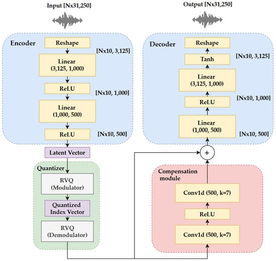 The proposed model consists of an encoder, quantizer, compensation module, and decoder. First, the encoder compresses the collected acoustic signal into a low-dimensional feature vector. The encoder architecture utilizes multiple linear layers and the ReLU activation function to transform the input signal into a latent vector. While the process is similar to previous approaches, the proposed model differs in that it does not directly reduce the latent space to 10 dimensions. Instead, it first compresses the input to 500 dimensions and then converts it into a 10-dimensional QIV through RVQ. This intermediate step of reducing to 500 dimensions offers an advantage over the conventional method [6], which compresses the input directly to 10 dimensions using stacked linear layers. By maintaining a 500-dimensional latent space, the model can preserve critical information in the signal more effectively.