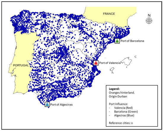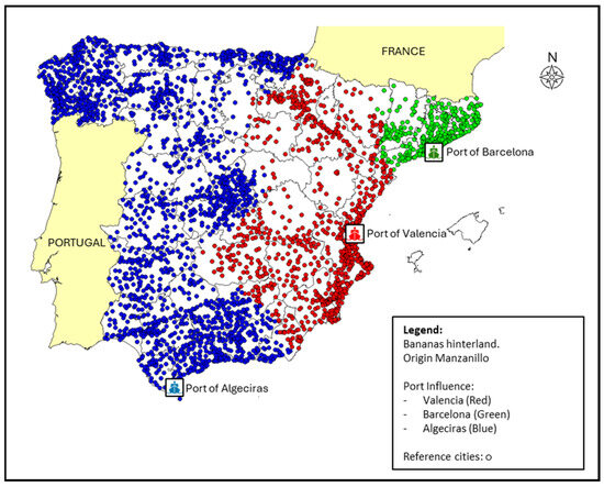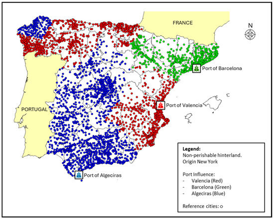 This study presents a methodology for determining port economic hinterlands through comprehensive logistics optimization. The research advances traditional geographical approaches by developing an integrated cost model that considers maritime transport, inland transportation, warehousing expenses, and time-dependent factors. Testing this methodology on the Spanish port system (with three main ports: Valencia, Algeciras, and Barcelona), we demonstrate how product characteristics and origins significantly influence optimal port selection and hinterland boundaries. The analysis examines both perishable goods, using bananas and oranges as case studies, and non-perishable cargo from Asian and American origins. Results reveal distinct patterns of port influence depending on goods type and origin. The study’s findings, visualized through innovative color-coded mapping, provide valuable insights for port authorities and logistics planners in optimizing supply chain decisions. Our approach contributes to port competition theory by establishing a quantitative framework for dynamic hinterland delineation based on actual logistics costs and operational factors.