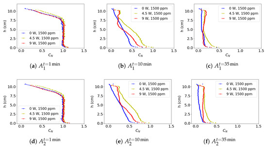 Figure 17 illustrates the effect of heat injection on normalized concentration . This is performed for four different columns, labeled , and . Examining column , it is observed that for , there is no significant difference in the concentration behavior for the different power levels. However, for , it is observed that heat-injected processes produce an almost homogeneous high zone with a lower concentration than the non-heated process. In the process of 9 W, a greater depth of homogeneity is observed, consistent with the behavior shown in Figure 10 and Figure 11, where the generation of a vertical and horizontal interface is observed at a higher rate than in the process with an initial concentration of 1500 ppm. At , the concentration along the column is essentially homogeneous for the process, this concentration being lower than the non-heated process in most of the columns analyzed. On the other hand, the case shows an intermediate behavior between the other two processes.