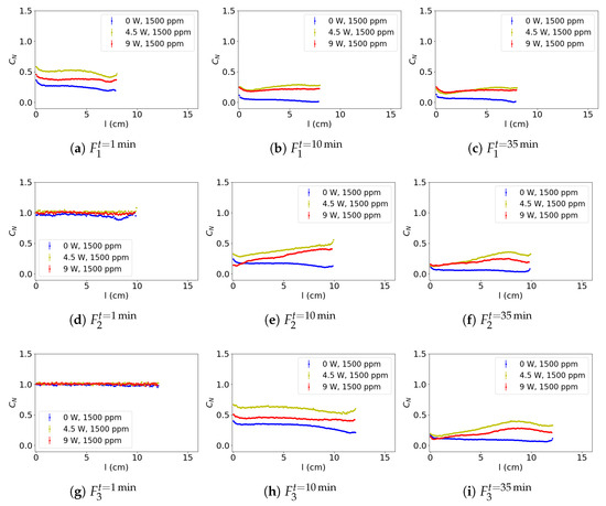 An analysis of columns and at 10 min reveals that, for an input power of 9 W, a lower concentration zone persists. In contrast, the concentration along column is higher in the upper zone and virtually identical in the lower zone when comparing the 4.5 W process with the non-heated process. In column , the impact of resuspension is observed to decrease over time, which is likely attributable to the lower amount of particles in suspension.