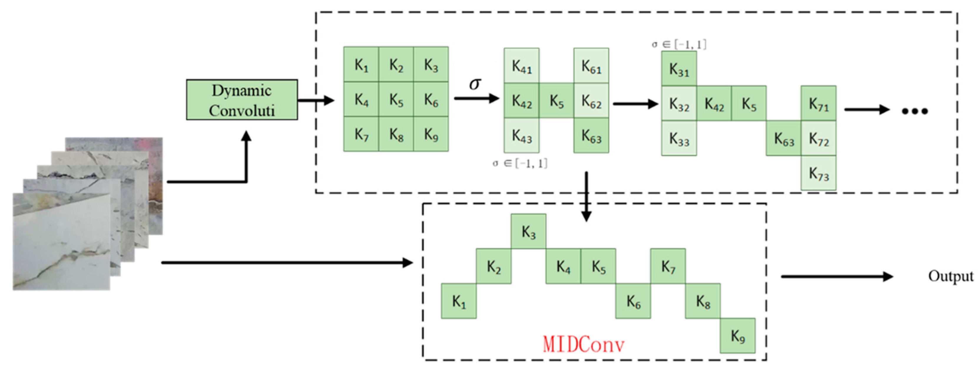 - Proposing morphology-integrated irregular dynamic convolution (MIDConv): By integrating the linear morphological features of cracks and constraining the offset accumulation of deformable convolutions, the receptive field of the convolution kernel is dynamically expanded along the crack orientation, effectively enhancing the ability to extract features of irregular edges.