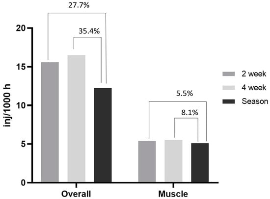 Descriptive statistics for overall and muscle injuries in three time frames.