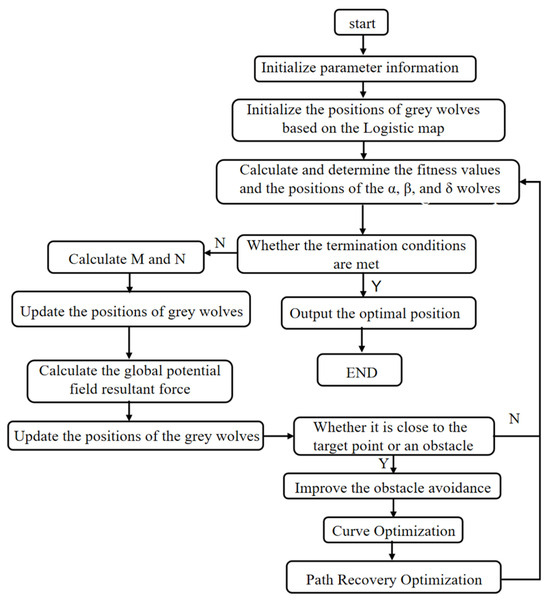 The purpose of the LAPGWO algorithm is to reduce the impact of complex environments on the efficiency of global path search. Using the logistic chaotic mapping method, the initial distribution of the grey wolf population is improved, the diversity of the population is enhanced, and the possibility of missing the global optimal solution is avoided. Combining with the artificial potential field (APF) method, the grey wolf group can be guided to accelerate the search toward the target point, effectively shortening the search range, reducing the computational workload, and improving efficiency.