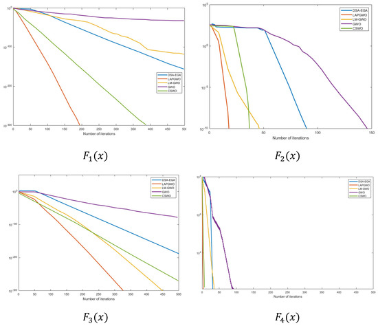As can be seen from Table 3, compared with the other four algorithms, the LAPGWO algorithm obtains an ideal average value, which indicates that the LAPGWO algorithm has better optimization performance; at the same time, the obtained standard deviations are all relatively small, indicating that the improved algorithm has good stability and enhanced local search ability. The LAPGWO algorithm successfully reaches its theoretical optimal value, that is, 0, in the tests of functions [list the functions here if there are specific ones]. This shows that, compared with other algorithms, the average value obtained by the LAPGWO algorithm in the test functions is the best, reflecting that the LAPGWO algorithm has stronger convergence, higher optimal accuracy, and greater stability.