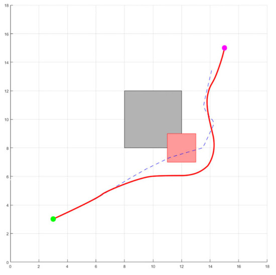 The gray squares represent static obstacles, the red squares represent dynamic obstacles, the blue trajectory is the original path trajectory, and the red trajectory is the optimized trajectory. As can be seen from the figure, when encountering dynamic obstacles, the local artificial potential field method starts to operate for dynamic obstacle avoidance. After the obstacle avoidance is completed, it can quickly and smoothly return to the original preset trajectory, proving the effectiveness of the method proposed in this paper.