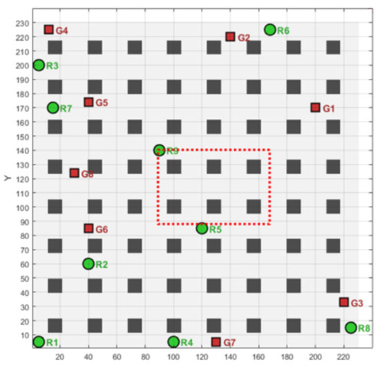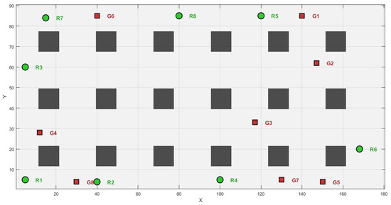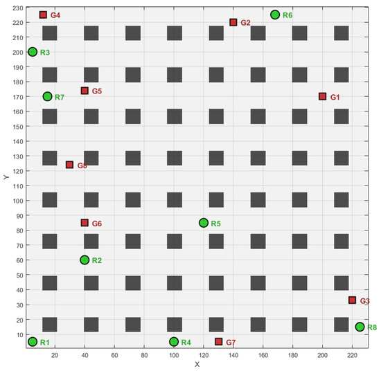 As shown in Figure 5, the rectangular warehouse environment is established. The robots’ initial and target positions are mainly distributed on the area’s periphery. The green circles represent the initial positions, and the red squares represent the target positions.
