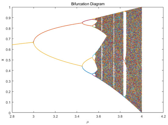 The chaotic interval of the grey wolf population is improved by adding the logistic chaotic mapping. However, the range of the chaotic interval is not the larger, the better. Because for the logistic mapping equation , when , the system is in the chaotic region, and the Lyapunov exponent > 0. The system enters the divergence region when > 4. The chaotic interval diagram is shown in Figure 6.