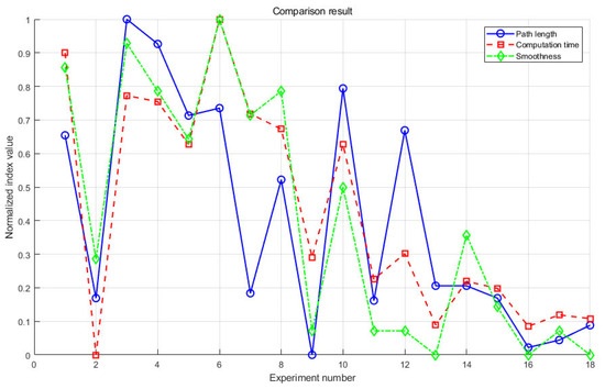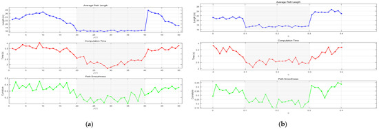 The positions of the obstacles, the initial point, and the robot’s target point are randomly assigned. The four algorithms’ performance is evaluated by the path length, planning time, path smoothness, and average number of iterations, as shown in Figure 13a–d.