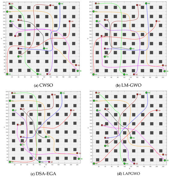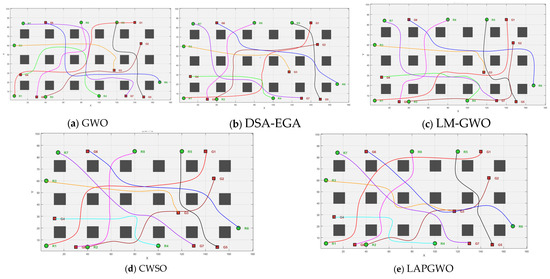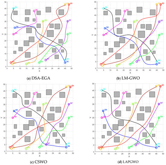 In the simulation experiments of this section, the advancement of the algorithm proposed in this paper is mainly verified. The core objective is conducting a horizontal comparative analysis by comparing it with efficient multi-agent path planning algorithms. The comparative algorithms are the grey wolf optimizer (GWO) algorithm, and the LM-GWO algorithm proposed in reference [26], the CWSO algorithm proposed in reference [28], and the DSA-EGA algorithm proposed in reference [31]. Thirty simulation tests are carried out, and each algorithm’s average path length, running time, and standard deviation are recorded. Furthermore, whether the algorithm in this paper can generate an approximately optimal path planning for the multi-agent system under a single time window constraint is examined.