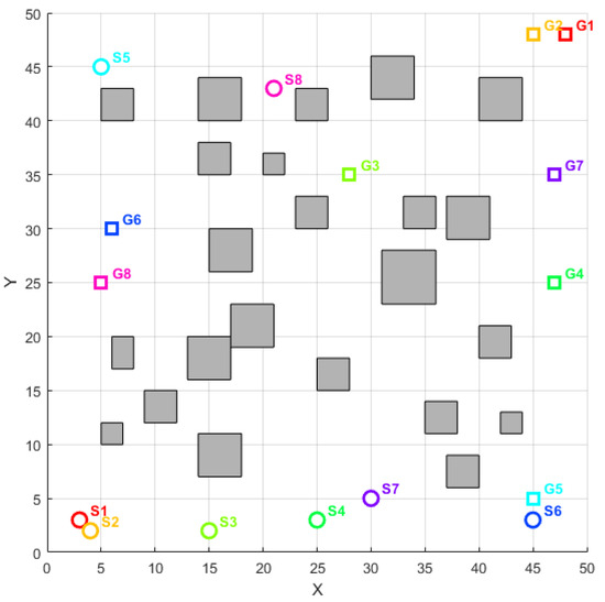 This section will conduct the simulation comparison and verification in three test scenarios to further verify the optimization performance of the LAPGWO algorithm in solving the path planning problem of multiple mobile robots in various environments. The complexity of the obstacles in the three scenarios varies to comprehensively evaluate the generalization ability of the LAPGWO algorithm proposed in this paper and its ability to adapt to the different requirements of the number of obstacles. The three scenarios are as follows: First, there is a simple warehouse environment with a width of 18 m and a length of 9 m. The number of robots is eight, and there are 18 obstacles. The specific scenario is shown in Figure 5. Second, there is a complex warehouse environment with a side length of 23 m. The number of robots is eight, and the number of obstacles is 64. Among them, the green circles represent the initial positions of the robots, and the red squares represent the positions of the target points. The specific scenario is shown in [the corresponding figure]. Finally, there is a non-warehouse environment with a side length of 50 m. The number of robots is eight, and the number of obstacles is 23. A distributed structure is adopted for control. However, considering the computing power of each robot, a unified calculation will be carried out on a single computer. After the calculation, the results will be transmitted to each robot to achieve the effect of distributed control.