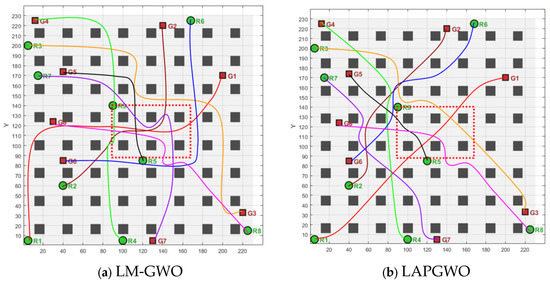 As can be seen from Figure 15, compared with the LM-GWO algorithm, the LAPGWO algorithm proposed in this paper can plan a path that can avoid obstacles in real time when facing the dynamically moving obstacle robot No. 9, with a conflict avoidance rate of 96%, ensuring the safety of the robot’s travel. However, when the LM-GWO algorithm faces the dynamic obstacle No. 9, it will encounter the problem of search failure multiple times and collide with No. 9, with a conflict avoidance rate of 88%, and the generated path is not the optimal path. The comprehensive comparison test results of the algorithms are shown in Table 9.