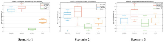 In this paper, multiple tests were carried out according to the three scenarios, and an ANOVA significance test was conducted on each algorithm based on the path length information. The test results of the three scenarios are shown in Figure 16. By adding significance verification, it is demonstrated that there are apparent differences between the LAPGWO algorithm and other methods.
