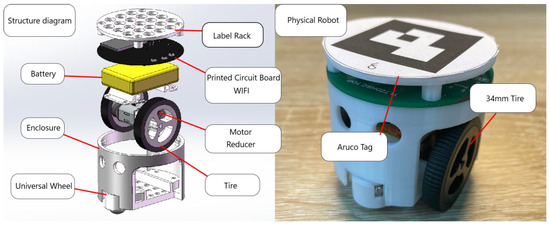 The structural composition diagram of the experimental robot is shown in Figure 17 and Figure 18. Figure 9 shows the pose recognition effect of the experimental robot. The experimental platform is composed of miniCup robots and a central controller, which can effectively identify the pose information of the robots. The upper computer identifies the ArUco tags through the camera to obtain the two-dimensional pose information of each robot. It transmits the real-time pose information of each robot to each robot through the local area network. Due to the computing power problem of the robots, in this section, the central controller will carry out unified processing, plan the path, and output the results to each robot to achieve the effect of distributed control. Due to the limited experimental conditions, the physical experiment environment in this section is verified based on the above simulation experiment. The verification map is shown in Figure 19, which is a physical warehouse environment. The size of the experimental map is simulated and built as 1/100 of the actual simulation environment.