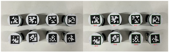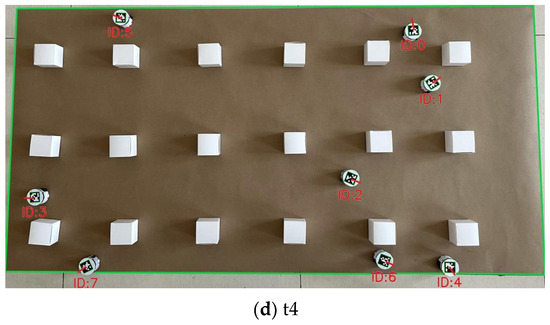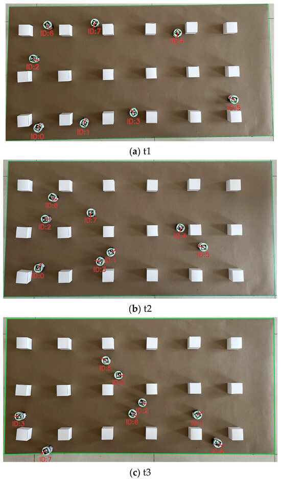 The physical experiment platform mainly includes a central controller, a visual recognition part, and mobile robots. The visual recognition uses the ArUco (augmented reality University of Cordoba) tag technology. The ArUco tag is square, with a black background, and the white rectangle inside stores numerical numbers and other information in a specific encoding. Each robot is pasted with a given ArUco tag in this section’s physical experiment. The camera identifies the ArUco tag on the robot and transmits the information to the control platform. After receiving the information, the control platform processes the information to determine the position information and number information of each robot. The information is displayed visually on the upper computer interface, which is convenient for debugging and data analysis.
