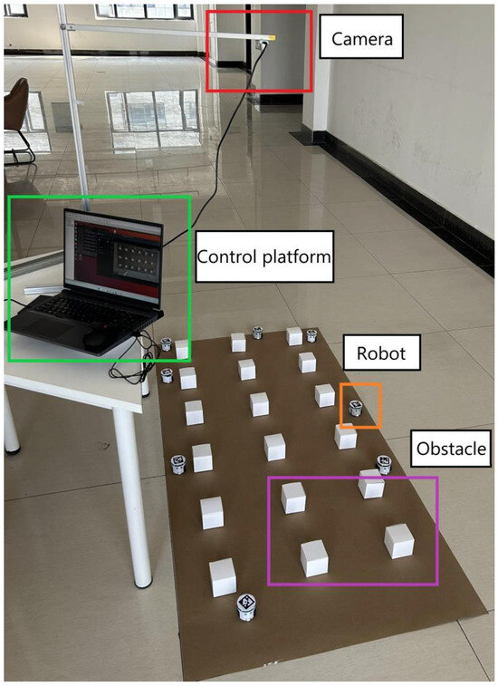 To verify the practical applicability of the method proposed in this paper, a small mobile robot independently built by the research group is used for a physical experiment. The experiment adopts a distributed structure. The main control center calls the global camera to identify the ArUco tags on the top of the mobile robots to obtain their positions, and the position information is fed back to the controllers of each mobile robot in real time. The robots will receive the transmitted position and global map information in real time. The robots share their pose information, autonomously calculate the generated trajectory, and perform obstacle avoidance according to the information. Considering the computing power of the small mobile robots, all data are calculated on the central controller, and the calculation results are transmitted to each small robot to achieve the effect of distributed control.