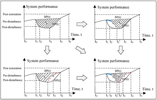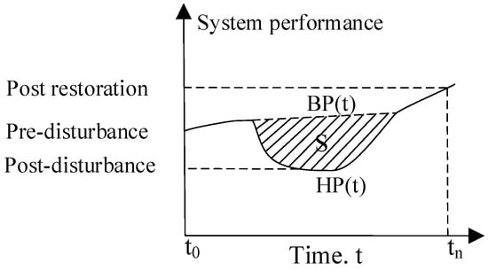 System resilience is closely related to system performance during disturbance [,]. Figure 1 shows hypothetical system performance curves during disturbance, HP(t), and during normal function, BP(t). The area between BP(t) and HP(t) can be used to evaluate the level of system resilience loss [].