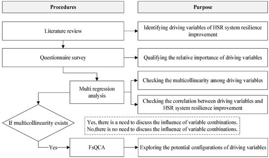 This study aims to explore ways to improve HSR system resilience from a holistic perspective. To achieve this goal, four steps were conducted, as illustrated in Figure 2. Firstly, an in-depth literature review was carried out to identify driving variables of HSR system resilience improvement. Secondly, a questionnaire (as shown in Appendix A) was designed and distributed to targeted respondents after a pilot survey with five professionals, aiming to collect experts’ opinions on these driving variables. Then, multi regression analysis was carried out to check if there is multicollinearity among the driving variables, as well as correlation between the driving variables and HSR system resilience improvement. Finally, fsQCA was conducted to analyze the driving variables from a configuration perspective.