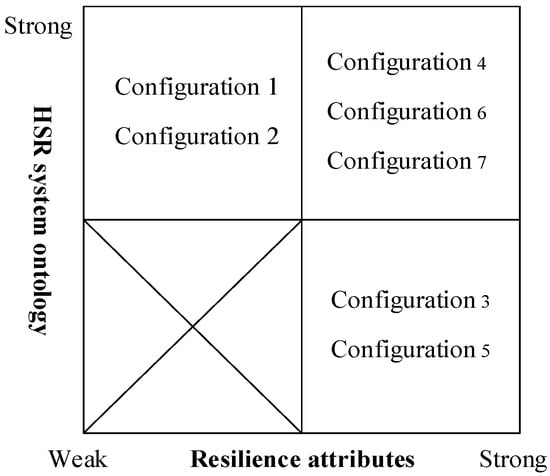 According to their necessary conditions, the seven configurations are divided into three categories, as shown in Figure 3. The first category is strong HSR system ontology–weak resilience attributes, including configuration 1 and configuration 2. The second category is weak HSR system ontology–strong resilience attributes, including configuration 3 and configuration 5. The third category is strong HSR system ontology–strong resilience attributes, including configuration 4, configuration 6, and configuration 7.