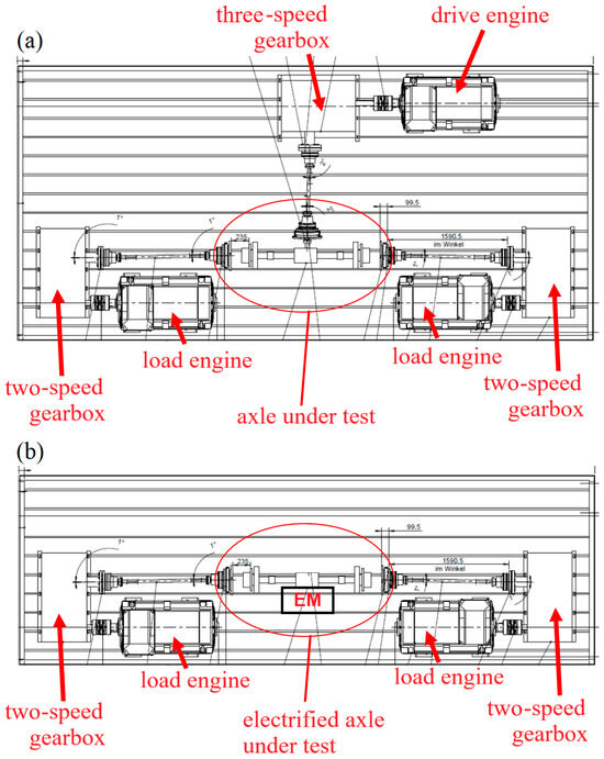 The EHAP was designed according to a three-motor concept, i.e., it has one drive motor and two load motors. Each of these motors has a continuous power rating of 550 kW. A DC source with up to 820 V and 1400 A continuous current that powers the axle inverter was used to test electrified axles. Optionally, motor modules with external converters can also be used for axles without vehicle-side inverters. With three gearboxes, maximum speeds of up to 160 km/h and mountain driving can be simulated for each axle type. The structure of a conventional axle on the clamping field is shown in Figure 1a. The structure for an electric axle is shown in Figure 1b.