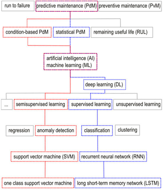 The red path leads to the development of an anomaly detection system for condition-based PdM using machine learning (ML). A special type of one-class support vector machine (OSVM) is to be used for this purpose. The blue path runs through statistical PdM. Using deep learning (DL), a classification task is to be solved by an artificial neural network (ANN). For this purpose, a long short-term memory (LSTM) network is selected, which can be assigned to recurrent neural networks (RNN). As shown, AI is the overarching concept for ML, of which DL is a subfield. It is possible to implement these methods directly in MATLAB 2022b, which was used in this work. This simplifies application to a specifically defined problem, and, in addition, the measurement data are already available in MATLAB and do not have to be converted from other data formats before evaluation. The two selected methods are presented in detail below.