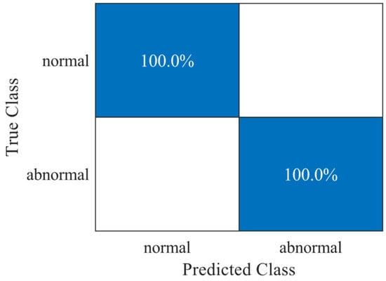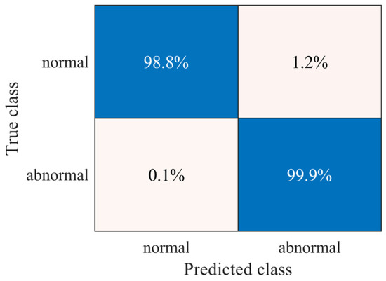 After the detailed introduction to the LSTM network used and the training process, Figure 5 shows the confusion matrix of classification by the LSTM network. It was trained using data from the first test and then applied to run 30 and run 460. The matrix shows that the network is very well suited for this classification task. It makes correct predictions for the normal class, with a high probability of 99.8%, and for the abnormal class, with a probability of 99.9%.