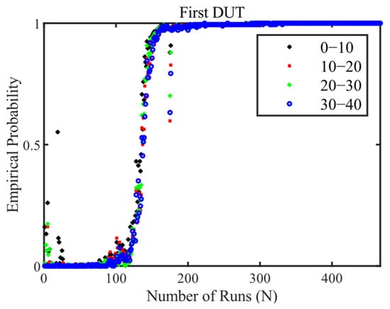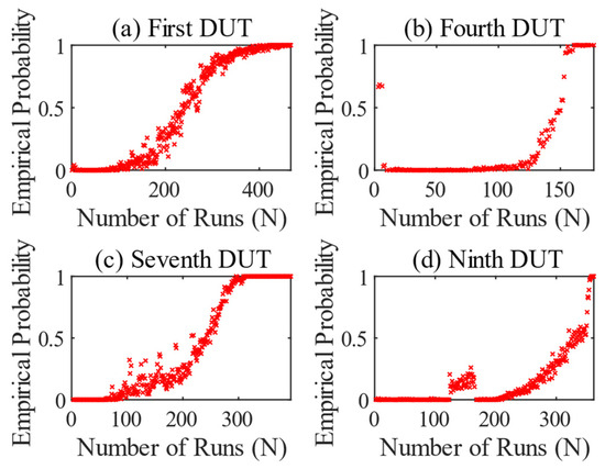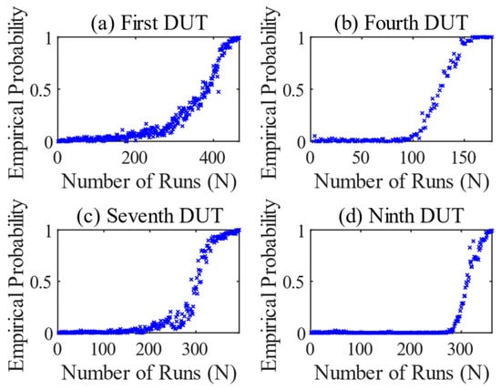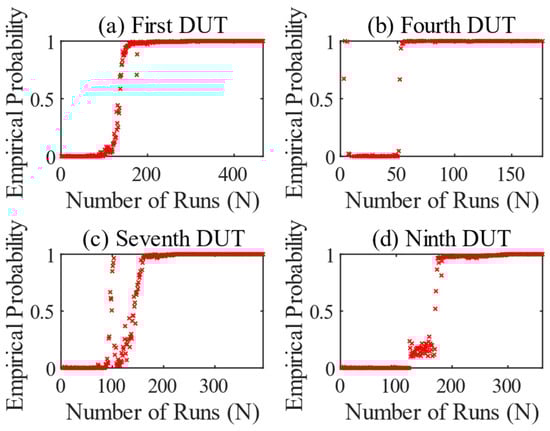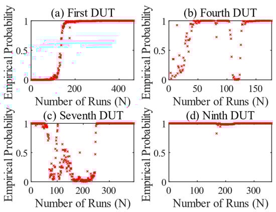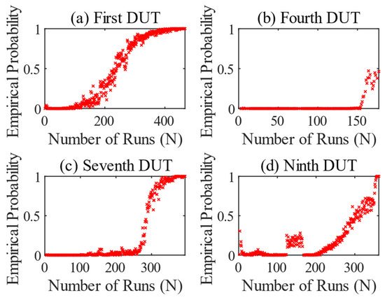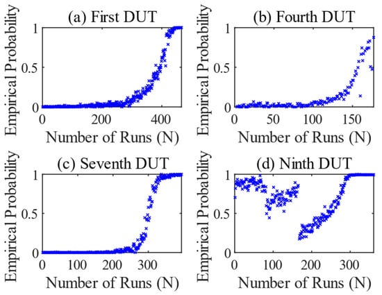 Figure 13 shows the results when a model trained on the first DUT is applied to the other tests, which follows the approach of statistical PdM. Graphs (a) and (c) in Figure 12 and Figure 13 show a high degree of correlation. The visible difference in (b) is because the model of the first DUT was trained on a missing tooth. When applied to the measurement data from the fourth test, in which no tooth was missing, the empirical probability in Figure 13b does not reach a value of 1 at the end of the test. The result of the ninth test in Figure 13d differs greatly from the condition-based PdM approach in Figure 12d. Obviously, the data at the beginning are too different to use the model of the first DUT. The behavior of the graph only normalizes from run 165 onwards. This is where the abnormal bellows was replaced. After that, the values of the empirical probability slowly increase with an increased spread and reach values around 1 from run 300 on.