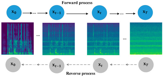 In speech enhancement tasks, clean speech is defined as the original speech signal, which includes only the speaker’s voice and excludes any external interference sources. Noisy speech refers to a speech signal that is mixed with other sound sources in addition to the speaker’s voice. The diffusion process consists of two stages: the forward process and the reverse process, as shown in Figure 1.