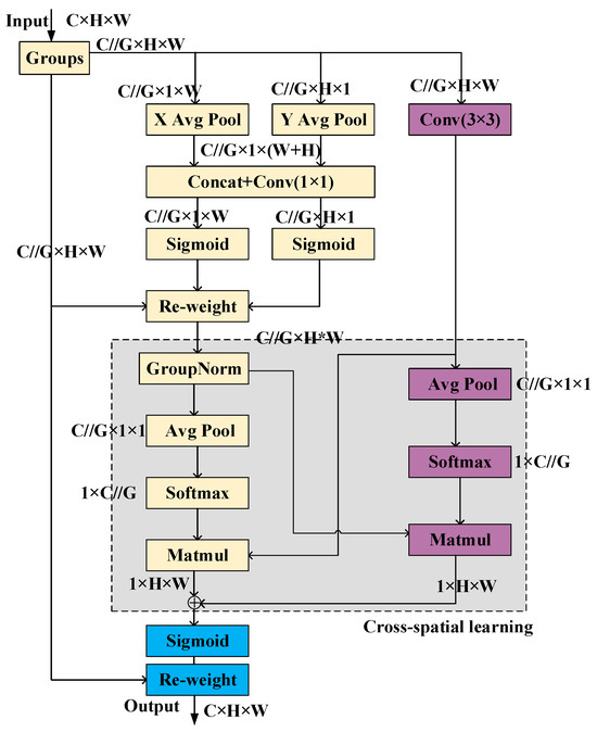 In the EMA mechanism, the global spatial information from the 1 × 1 convolution branch is processed by applying Softmax activation to generate channel-wise attention weights, while the 3 × 3 convolution branch output is reshaped to match the dimensions of the 1 × 1 branch. The features from these two branches are then combined through matrix multiplication, leading to the formation of the first spatial attention map. At the same time, a 2D average pooling operation is performed on the 3 × 3 branch, and the resulting features are passed through a Softmax function to produce another set of attention weights. Similarly, the 1 × 1 branch output is reshaped, and matrix multiplication between the two branches yields the second spatial attention map. To refine the spatial attention distribution, the EMA module aggregates the feature outputs guided by the attention maps from both branches. This design allows the model to exploit complementary spatial features learned in parallel, enhancing its ability to capture richer contextual information. In this way, when the model performs attention calculations, it not only considers the current input features but also effectively integrates contextual information from previous layers.