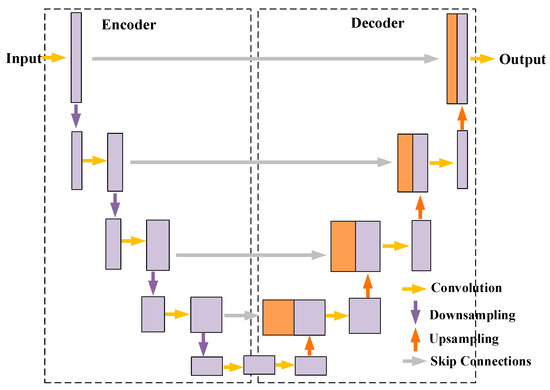 In recent years, significant progress has been made in enhancing acoustic quality through deep learning methods, with the U-Net architecture emerging as a particularly effective model [50,51]. As illustrated in Figure 3, the U-Net consists of three main components: an encoder, a decoder, and skip connections. Specifically, the encoder progressively downsamples the input audio to extract high-level acoustic representations, while the decoder performs upsampling to reconstruct enhanced audio with dimensions matching the original input. The skip connections directly transfer feature maps from the encoder to the corresponding decoder layers, enabling the integration of low-level and high-level information to facilitate more accurate detail restoration.