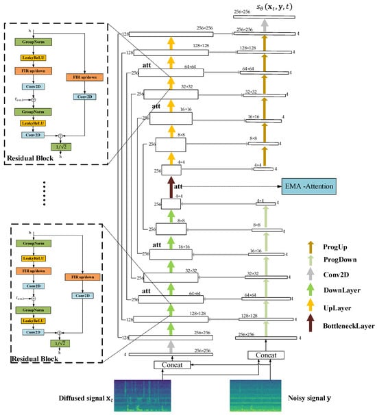 The main body of the network consists of symmetrical downsampling and upsampling paths, along with skip connections. The input and output layers use Conv2D layers with 3 × 3 convolution kernels and a stride of 1. The residual block structure derived from the BigGAN architecture [53] is embedded in both the downsampling and upsampling blocks. Each residual block consists of the same Conv2D layer as above, group normalization [54], LeakyReLU activation function, and either upsampling or downsampling layers based on finite impulse response (FIR) filters [55]. Each downsampling path contains two residual blocks, and each upsampling path contains three residual blocks [56]. A 1 × 1 Conv2D layer is employed to facilitate the progressive transformation of feature dimensionality [57]. The network performs symmetrical dimensionality reduction and expansion through feature maps of specific resolutions. The output dimensions of the downsampling paths are (256, 256, 128), (128, 128, 128), (64, 64, 256), (32, 32, 256), (16, 16, 256), (8, 8, 256), and (4, 4, 256). To enhance feature fusion, an EMA mechanism is added to the bottleneck layer and the 16 × 16 and 64 × 64 resolution layers. The overall architecture supports efficient gradient propagation and multi-scale feature aggregation through the combination of residual connections and attention mechanisms, showing significant performance advantages in speech enhancement tasks.