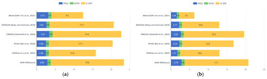 When the training and testing datasets were mismatched—that is, when the models were trained on the VB-DMD dataset and evaluated on the TIMIT-TUT dataset—we evaluated model performance under these mismatch conditions. We tested the TIMIT-TUT data using pretrained models provided in the official codebases of the respective papers. The experimental results are summarized in Table 7. To provide a more intuitive comparison, the average values of each metric in Table 7 are visualized in Figure 5b. As expected, the overall performance declined compared to the matched condition results in Table 4. This drop is primarily attributed to the fact that the specific characteristics of the test set were not exposed during training. The signal characteristic differences between the VB-DMD training data and the TIMIT-TUT test set were significant enough to cause a degradation in the evaluation scores.