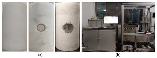 Test equipment and materials: (a) specimens: intact, with prefabricated hole, and with cement paste-filled hole; (b) multifunctional rock mechanics tester.
