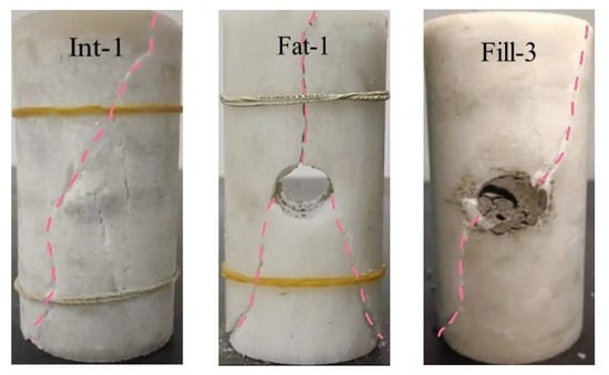 The final failure modes of the three specimen types are shown in Figure 3. For the intact specimens, the damage pattern shows typical shear damage with shear cracks penetrating to form the damage surface. When the specimen contains hole flaws, stress concentration occurs around the hole, especially in the direction of the principal stress, and typical wing cracks appear in the area of stress concentration of the hole and expand in the direction of the principal stress, eventually showing an inverted “Y”-shaped distribution. For the specimens with cement-filled holes, the presence of the filler makes the stress state around the holes still three-way stress, but with loading and crack development and expansion, the slurry-filled area and the holes are separated, resulting in the slurry being extruded from the holes; the final destruction of the macroscopic cracks is similar to that of the intact rock specimens, for the two macroscopic diagonal shear cracks, and the failure mode is mainly characterized by shear damage.
